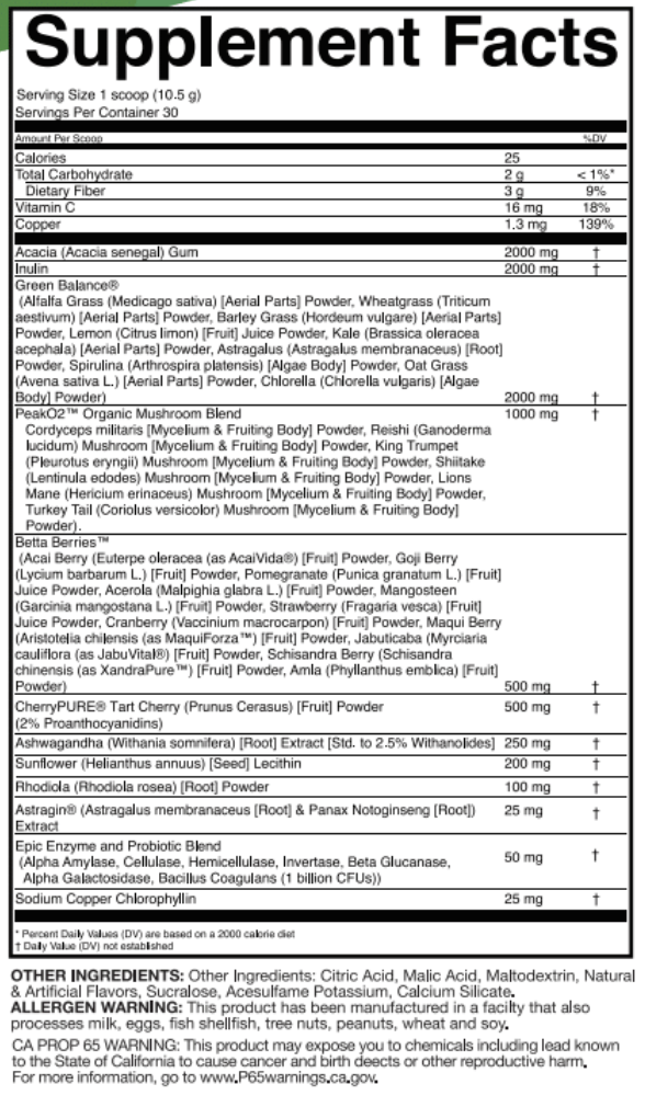 A potent and powerful patented ingredient that is made up of essential compounds that, when combined, help energize the body and support the replenishment of crucial minerals. Green Balance utilizes specific vitamins, minerals, phytonutrients, chlorophyll, and live enzymes to help boost immunity and improve overall health.