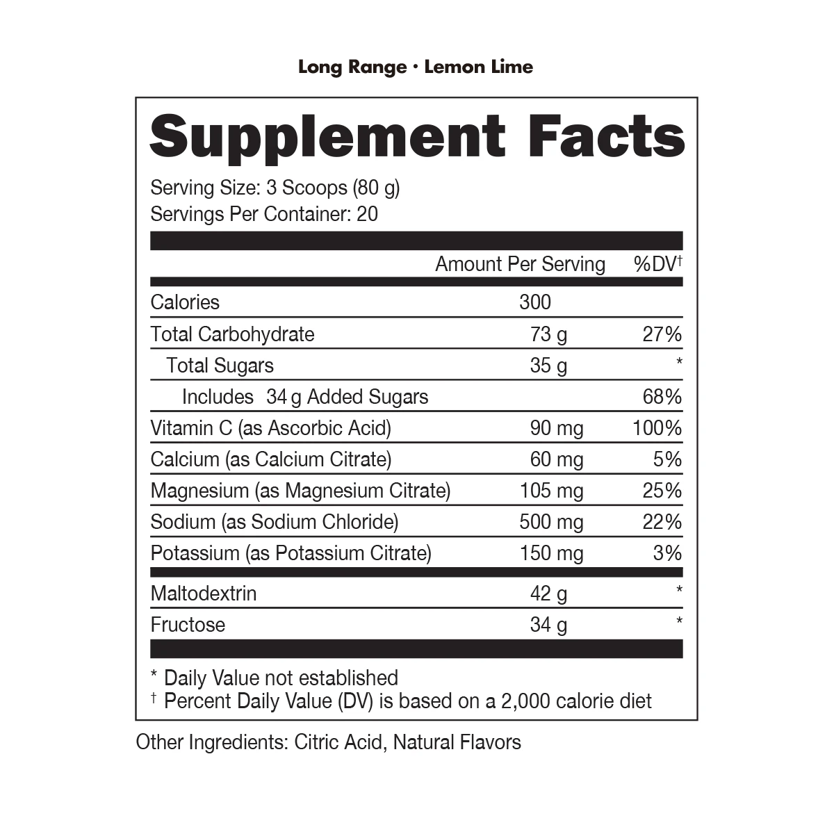 LONG RANGE is formulated to deliver the proper balance of hydration ingredients to allow endurance athletes to simultaneously rehydrate and push themselves during exercise.*