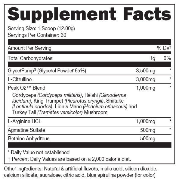 Betaine Anhydrous and GlycerPump increase cellular hydration to ensure your muscles are receiving as much of the nutrients they so desperately need to reach their full size. Most pump products work only on improving your pump -- surprise. Not us. We want more. We’re insatiable. You should be too. We add in PeakO2, which has been shown to increase power output over time.