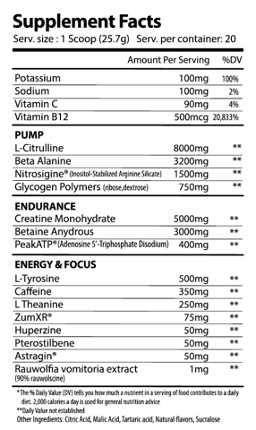 Rauwolfia Vomitoria Extract: Amplifies focus and energy for a sharper, more intense workout.